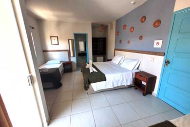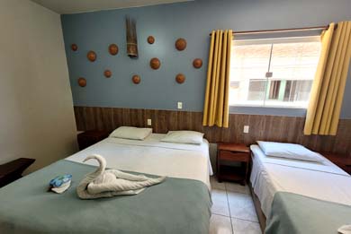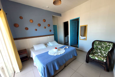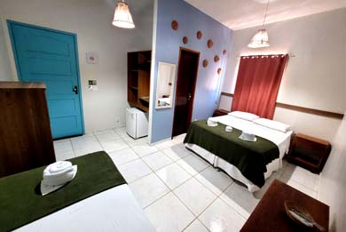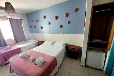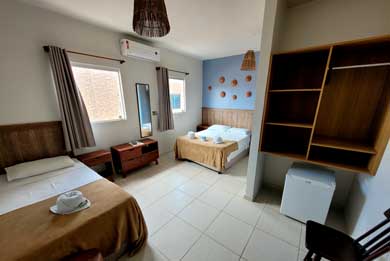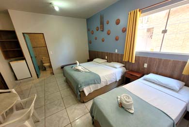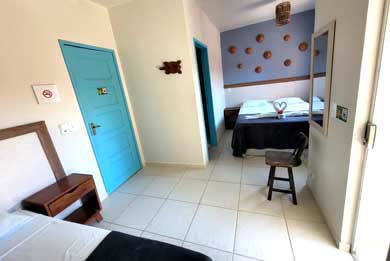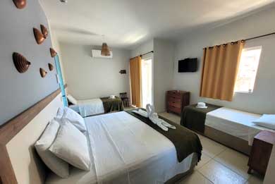 A Pousada Tartaruga tem suítes para duas, três ou quatro pessoas com cama de casal e camas de solteiro, banheiro com Box, ducha higiênica e chuveiro quente com aquecedor solar, TV LED / LCD 32" ou 43", frigobar e Ar condicionado Split.